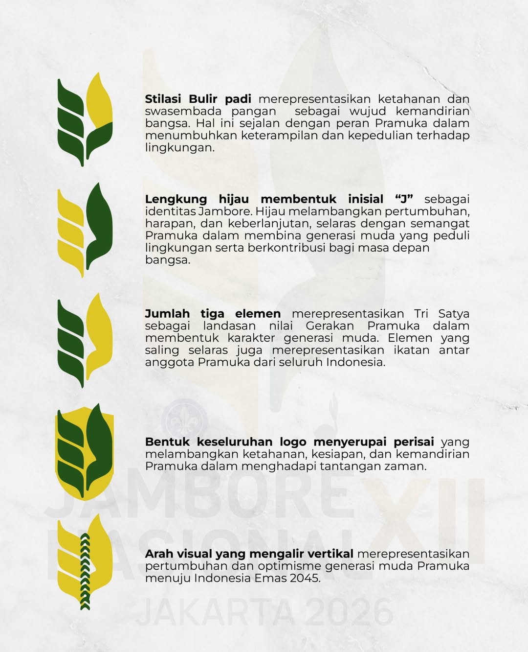 Logo ini juga memuat pesan strategis terkait komitmen Gerakan Pramuka dalam mendukung swasembada pangan sebagai bagian dari kontribusi nyata terhadap pembangunan nasional, sejalan dengan arah kebijakan pemerintah.